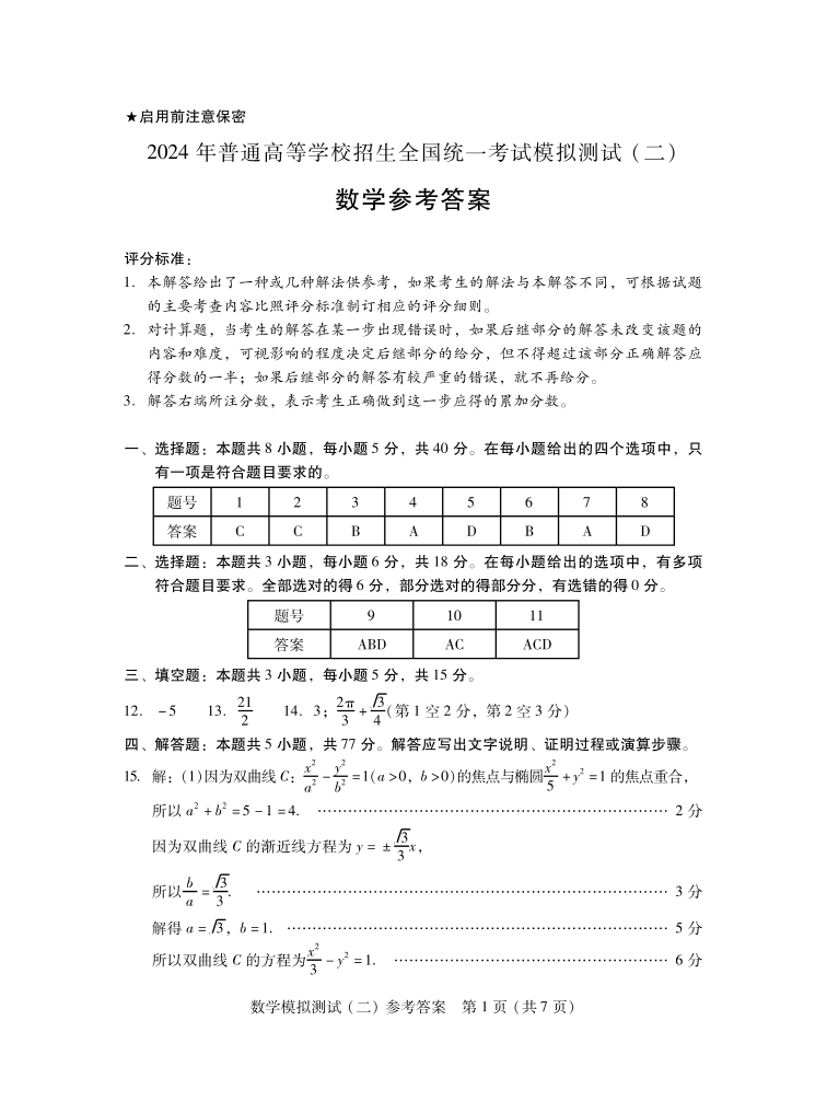 广东省2024年高三下学期普通高中学业水平选择考模拟考试(广东二模)数学答案