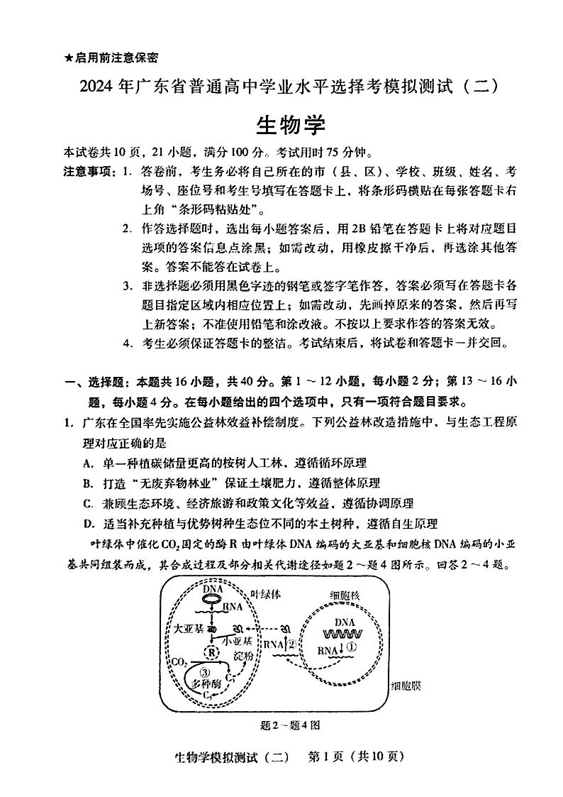 广东省2024年高三下学期普通高中学业水平选择考模拟考试(广东二模)生物+答案