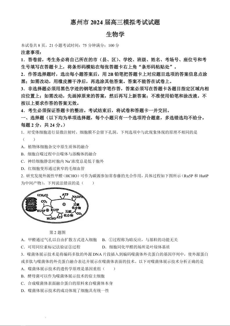 广东省惠州市2024届高三4月模拟考试(惠州一模)生物+答案