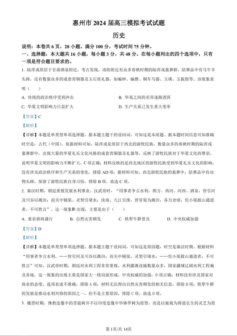 广东省惠州市2024届高三4月模拟考试(惠州一模)历史(精品解析版)