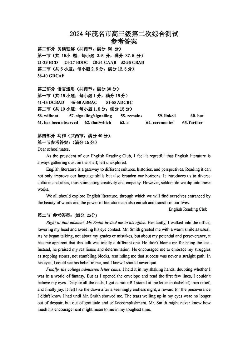 广东省茂名2024年高三年级第二次综合测试(茂名二模)英语答案
