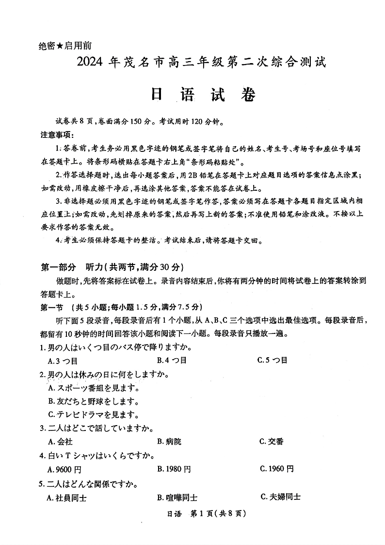 广东省茂名2024年高三年级第二次综合测试(茂名二模日语