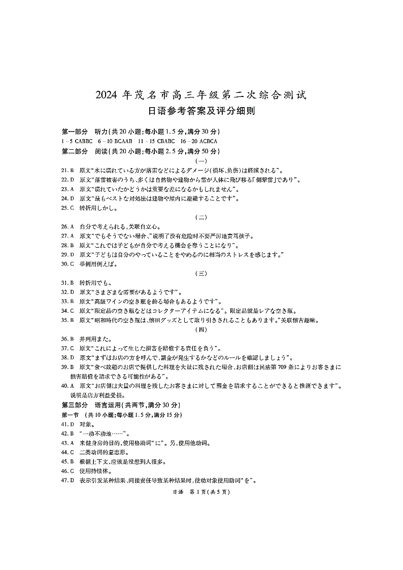 广东省茂名2024年高三年级第二次综合测试(茂名二模日语答案