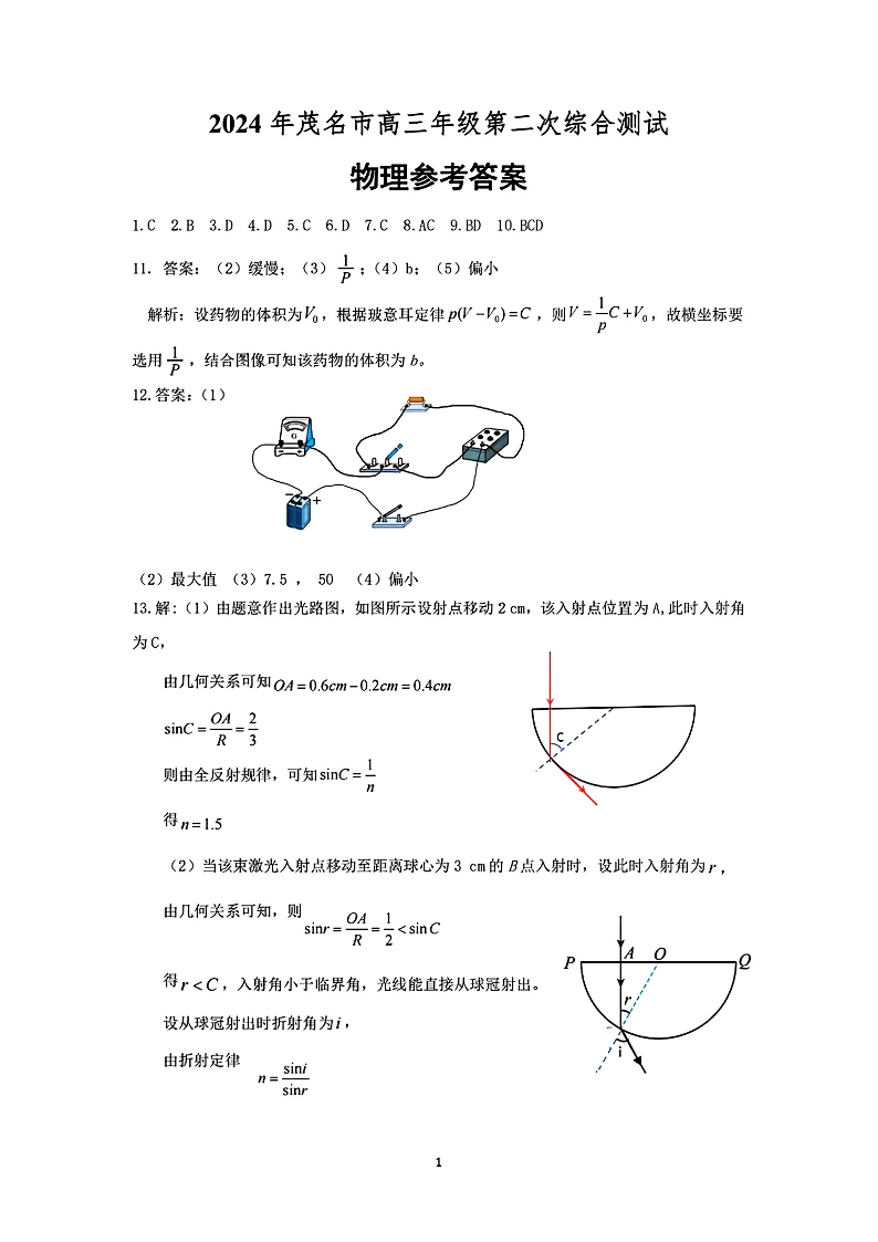 广东省茂名2024年高三年级第二次综合测试(茂名二模)物理答案
