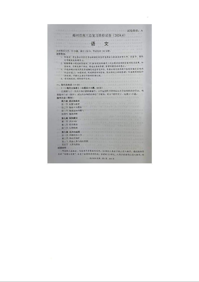 广东省梅州市2024届高三年级4月总复习质检(二模)语文+答案