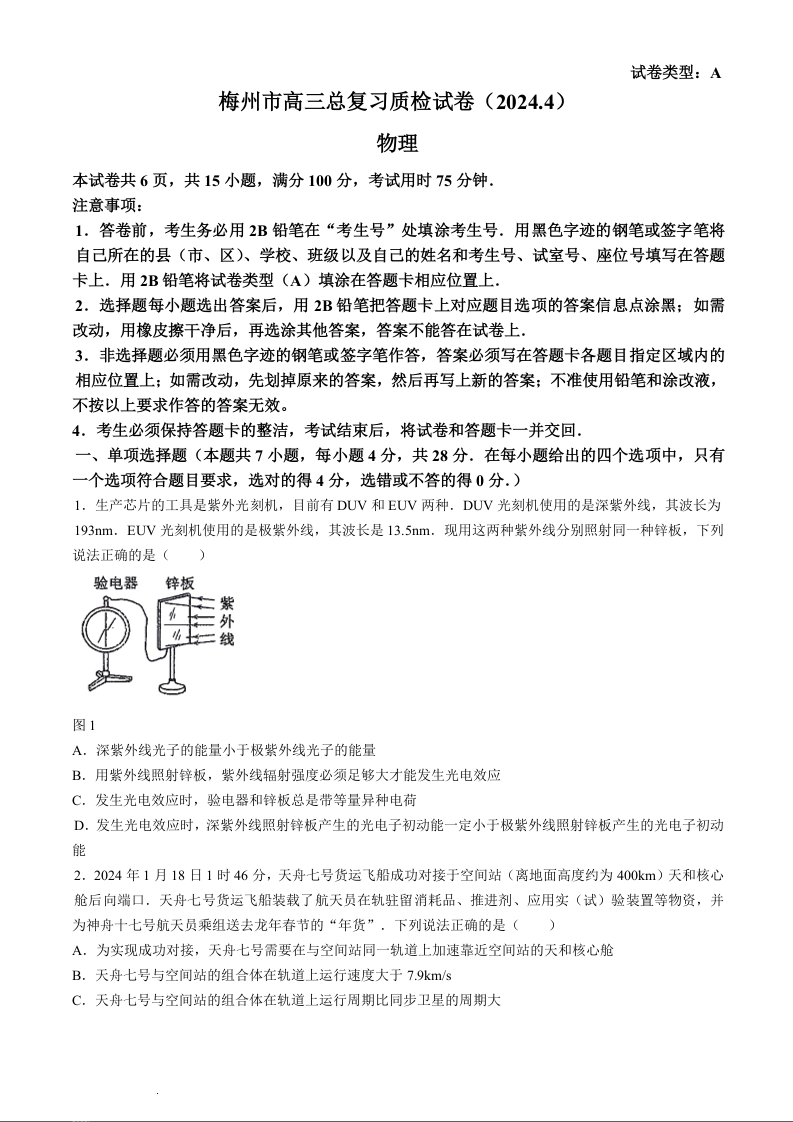 广东省梅州市2024届高三年级4月总复习质检(二模)物理+答案