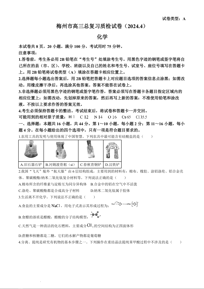 广东省梅州市2024届高三年级4月总复习质检(二模)化学