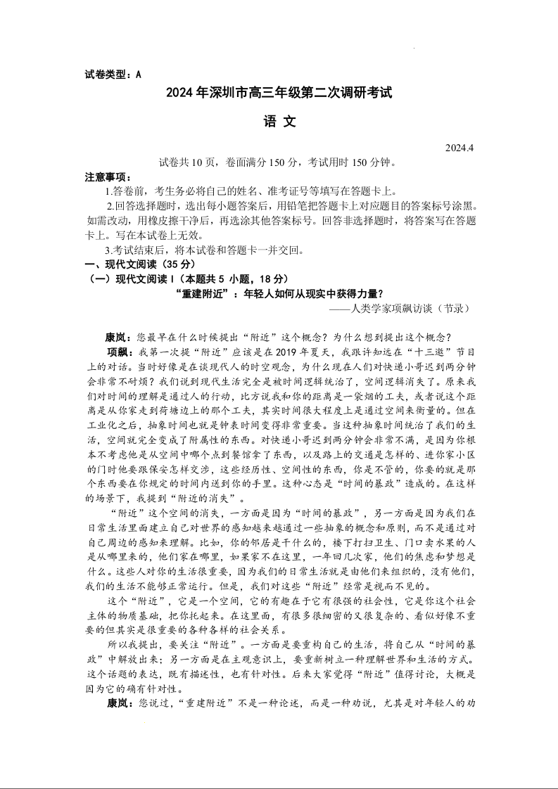 广东省深圳市2024届高三年级第二次调研考试语文+答案