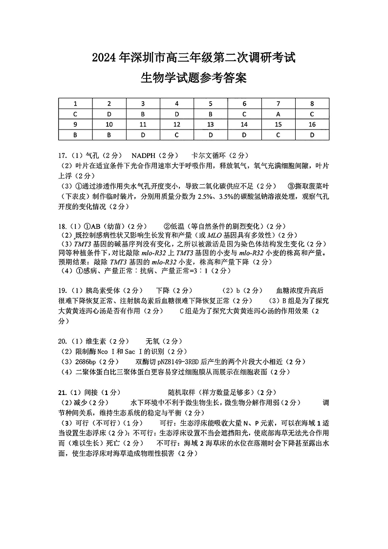 广东省深圳市2024届高三年级第二次调研考试生物答案