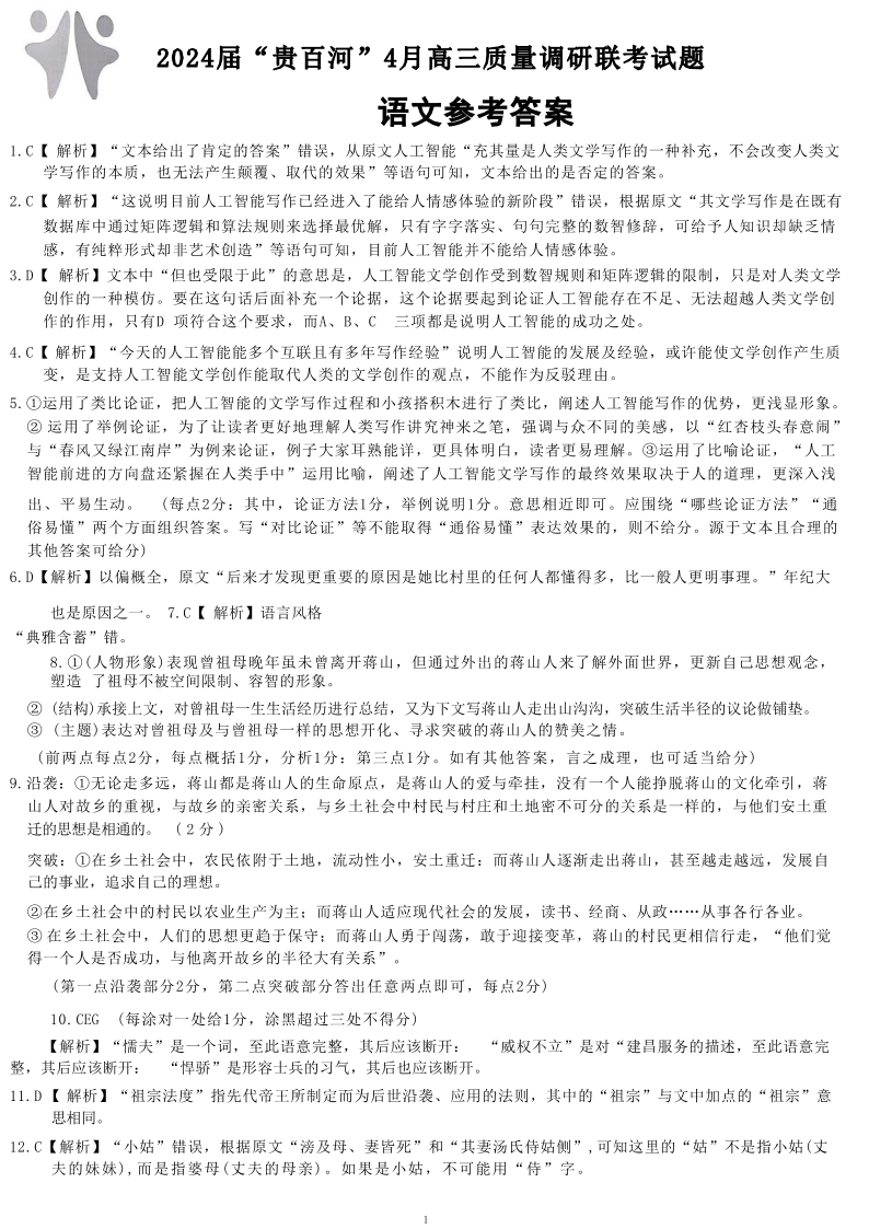 广西省2024届“贵百河”4月高三质量调研联考语文答案