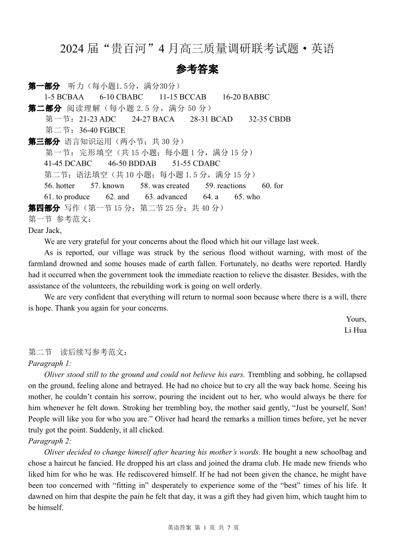 广西省2024届“贵百河”4月高三质量调研联考英语答案