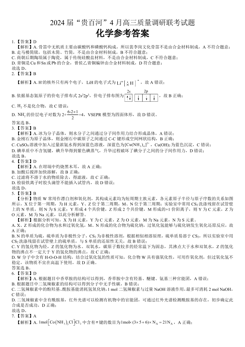 广西省2024届“贵百河”4月高三质量调研联考化学答案