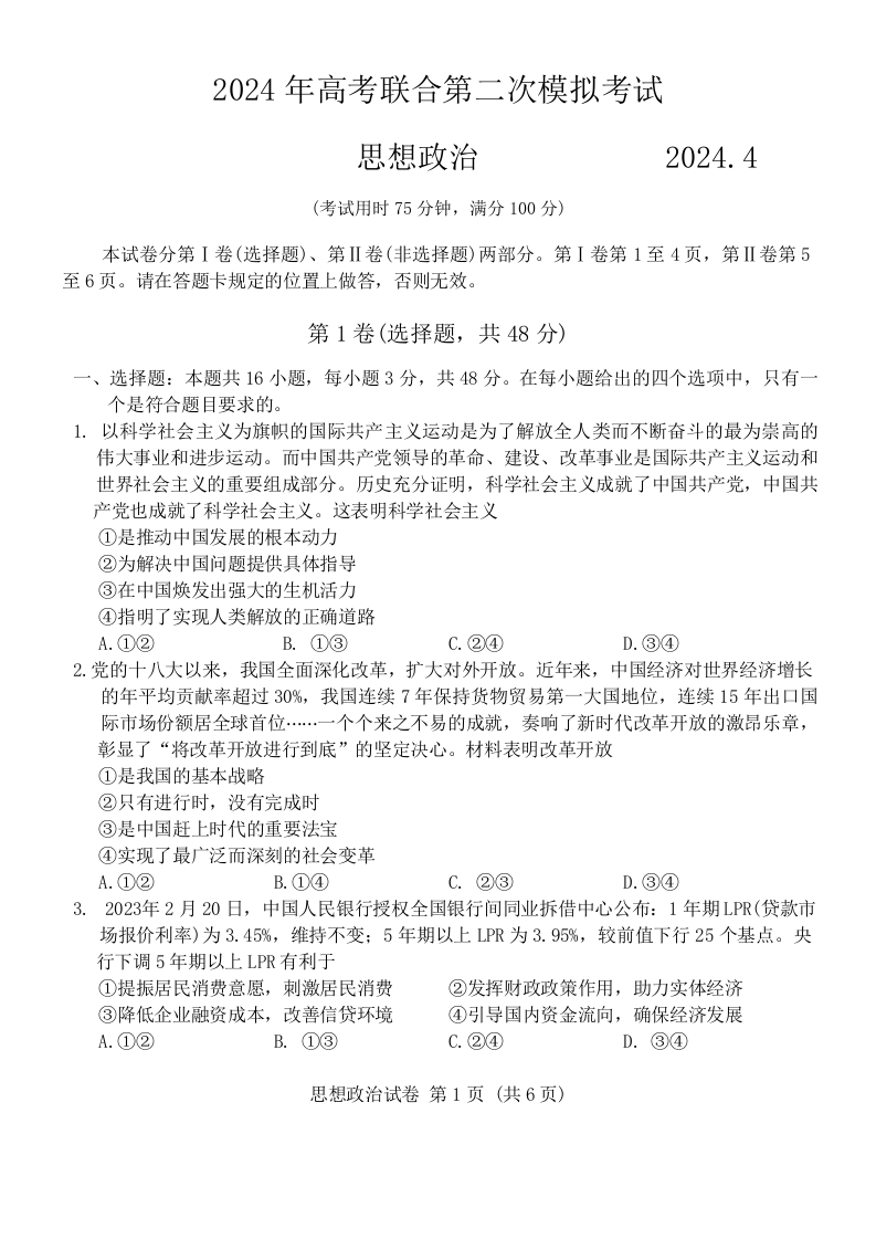 广西省2024年高考第二次联合模拟考试政治