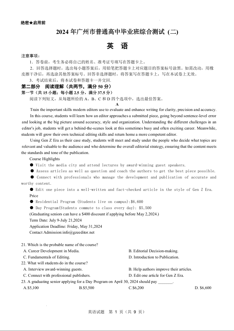 广州市2024 年普通高中毕业班综合测试(二)(广州二模)英语+答案