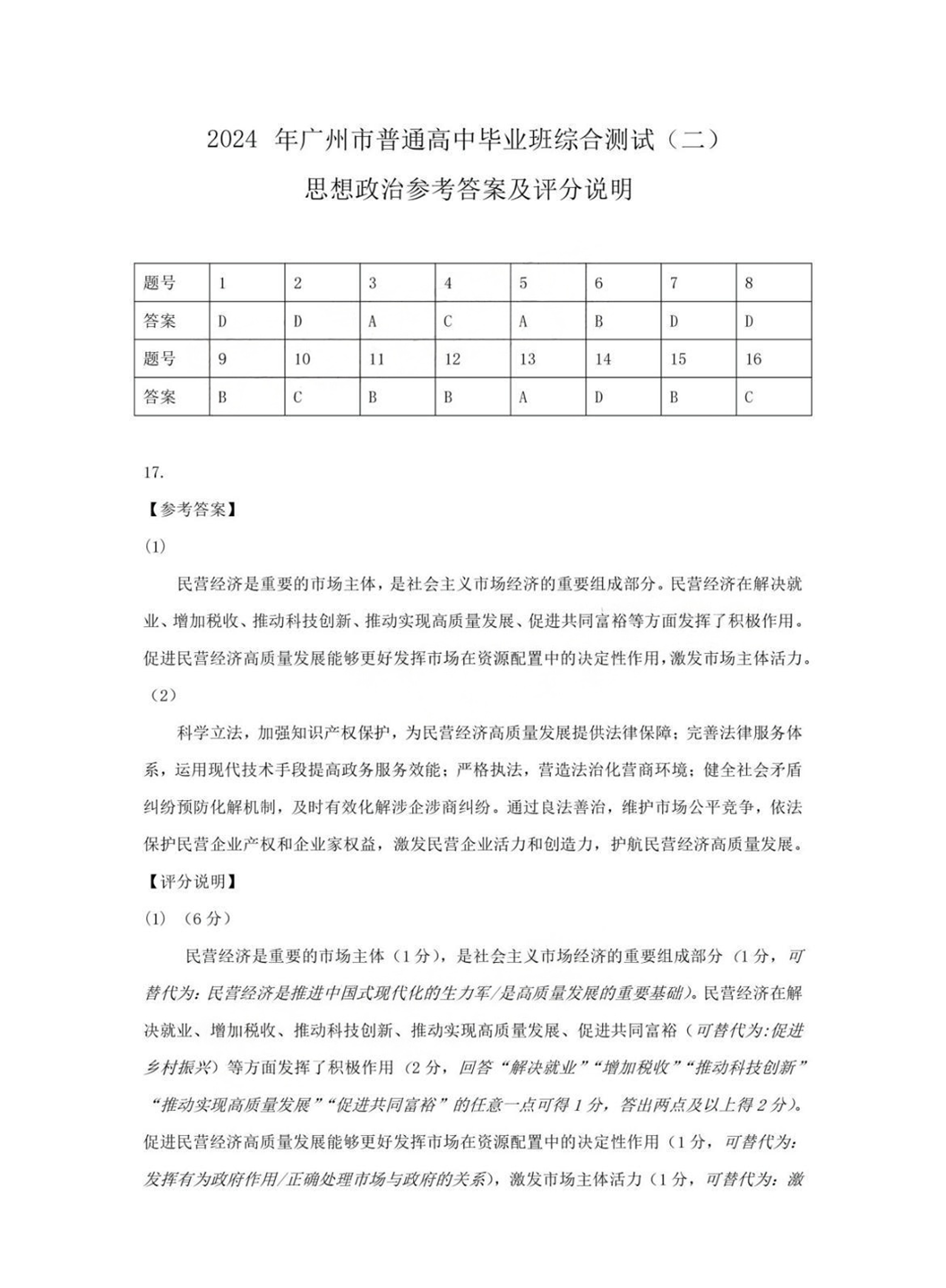 广州市2024 年普通高中毕业班综合测试(二)(广州二模)政治答案