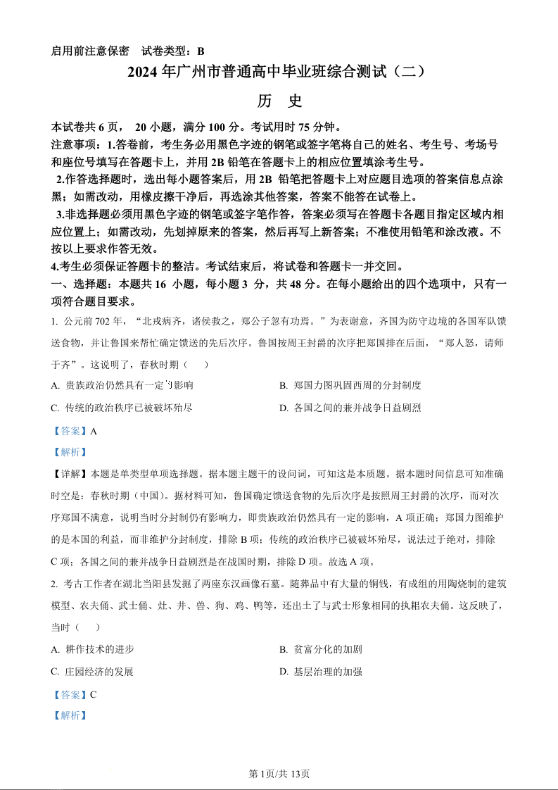 广州市2024 年普通高中毕业班综合测试(二)(广州二模)历史(精品解析版)