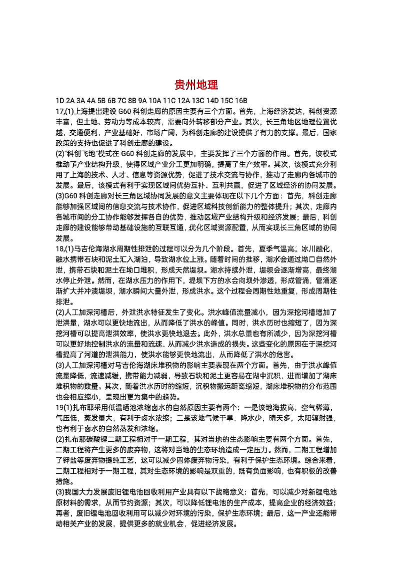 贵州省2024年高三年级4月适应性考试地理答案