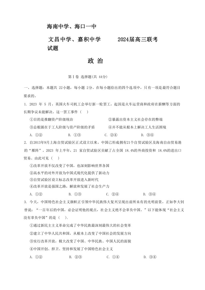海南省四校(海南中学、海口一中、文昌中学、嘉积中学)2024届高三下学期一模政治+答案