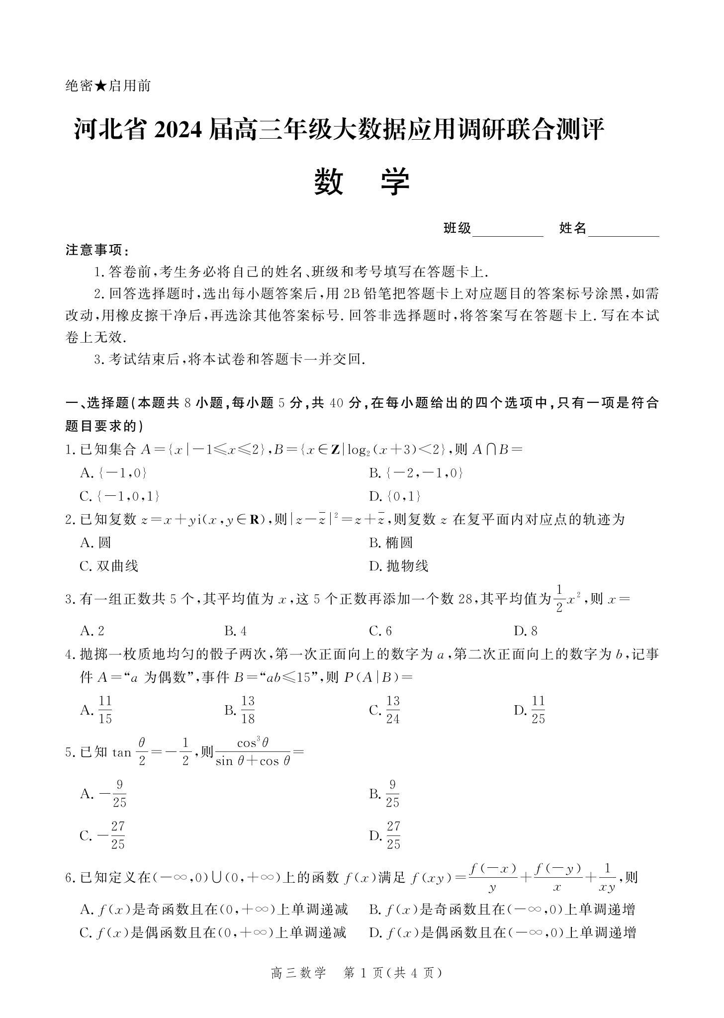 河北省2024届高三大数据应用调研联合测评(Ⅵ)数学
