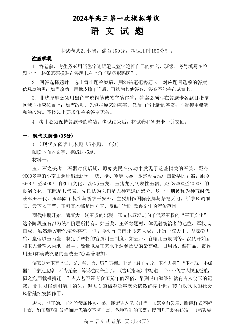 河北省保定邢台市2024年高三第一次模拟考试(保定邢台一模)语文