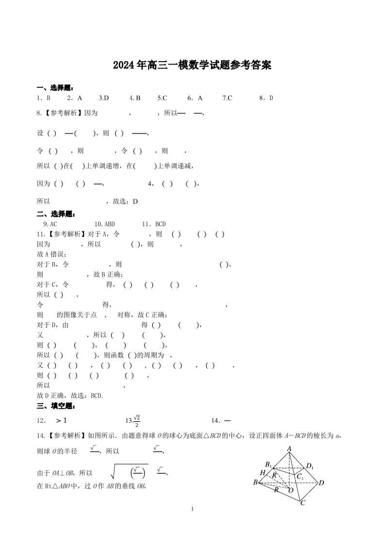 河北省保定邢台市2024年高三第一次模拟考试(保定邢台一模)数学答案