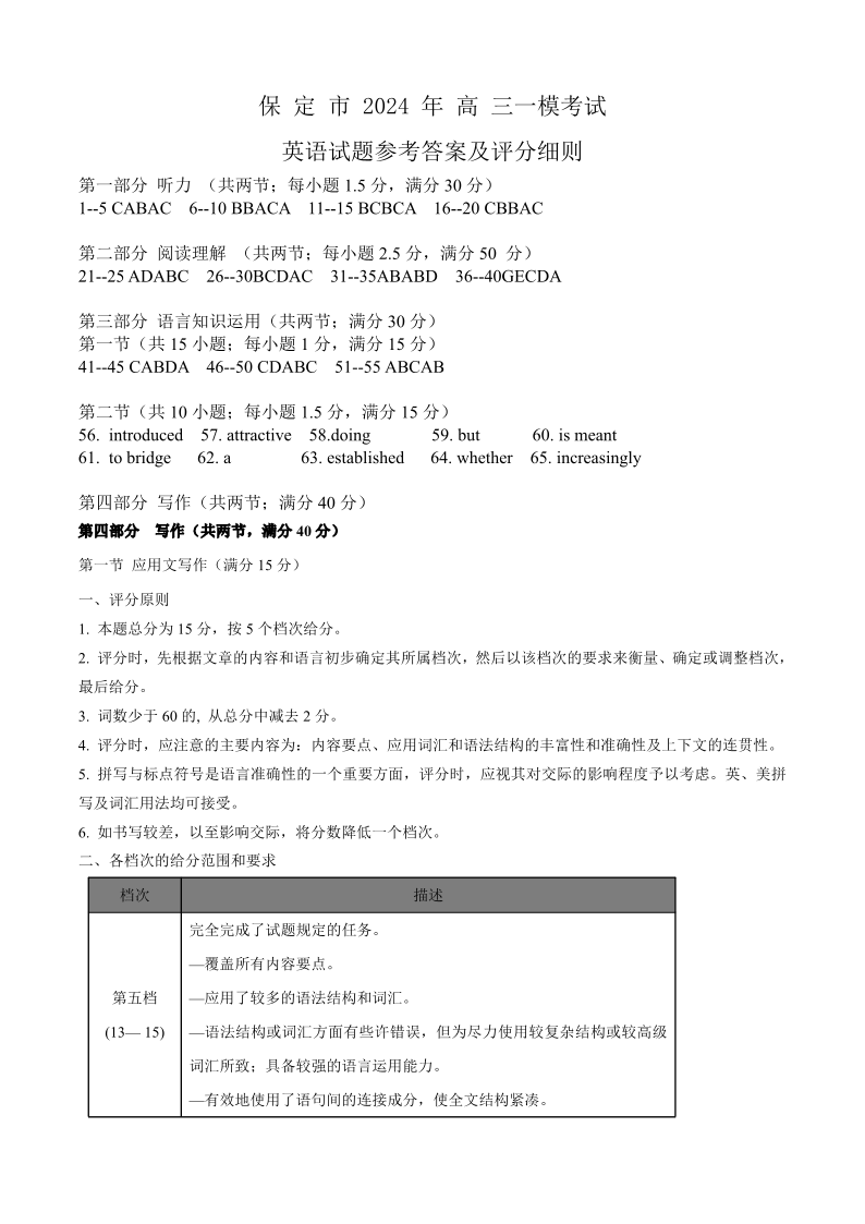 河北省保定邢台市2024年高三第一次模拟考试(保定邢台一模)英语答案