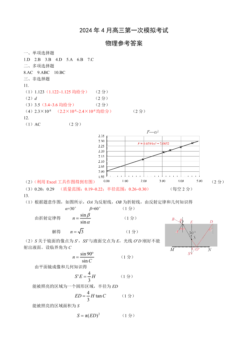 河北省保定邢台市2024年高三第一次模拟考试(保定邢台一模)物理答案
