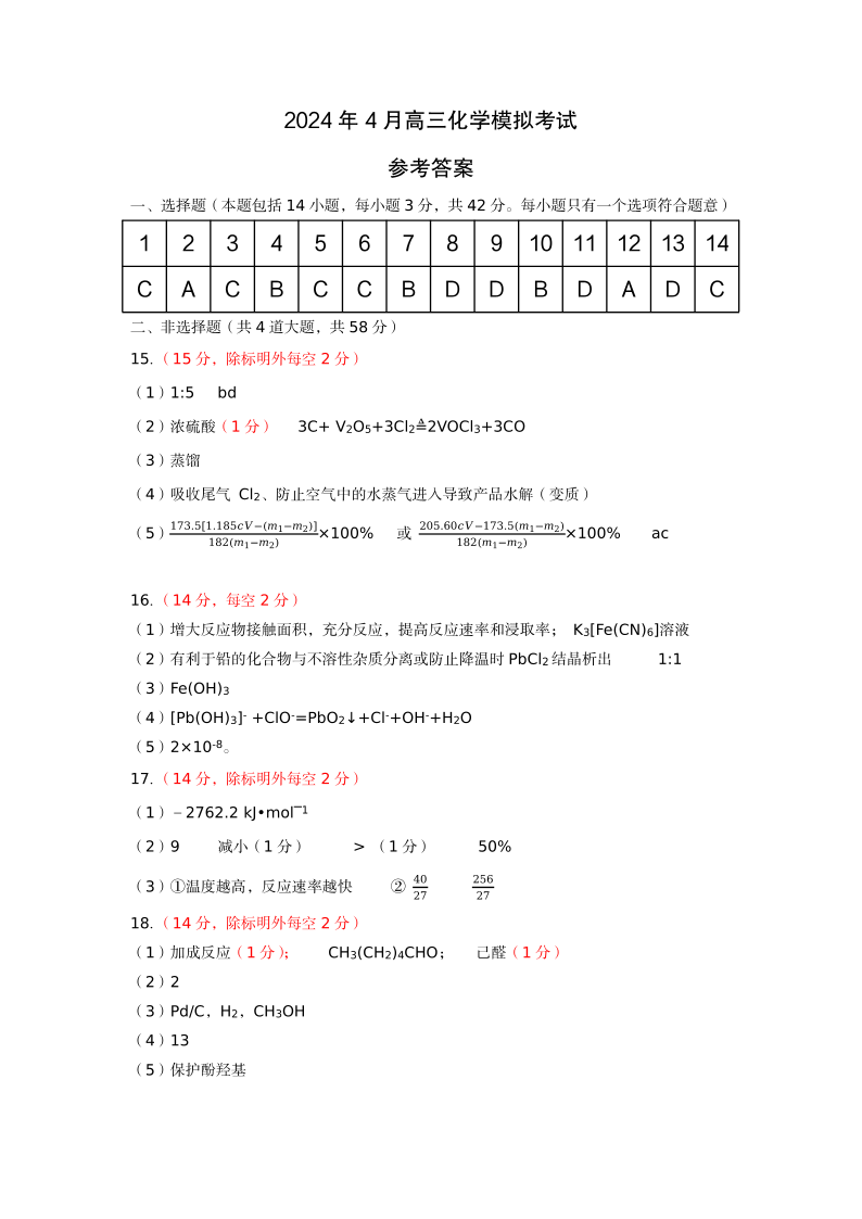 河北省保定邢台市2024年高三第一次模拟考试(保定邢台一模)化学答案