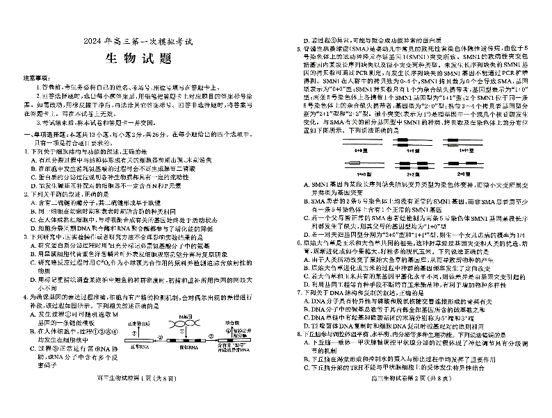 河北省保定邢台市2024年高三第一次模拟考试(保定邢台一模)生物