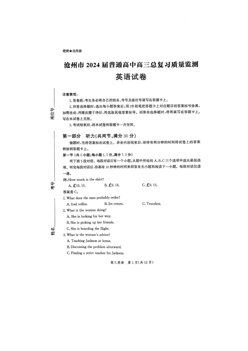 河北省沧州市2024届普通高中高三总复习质量监测(二模)英语