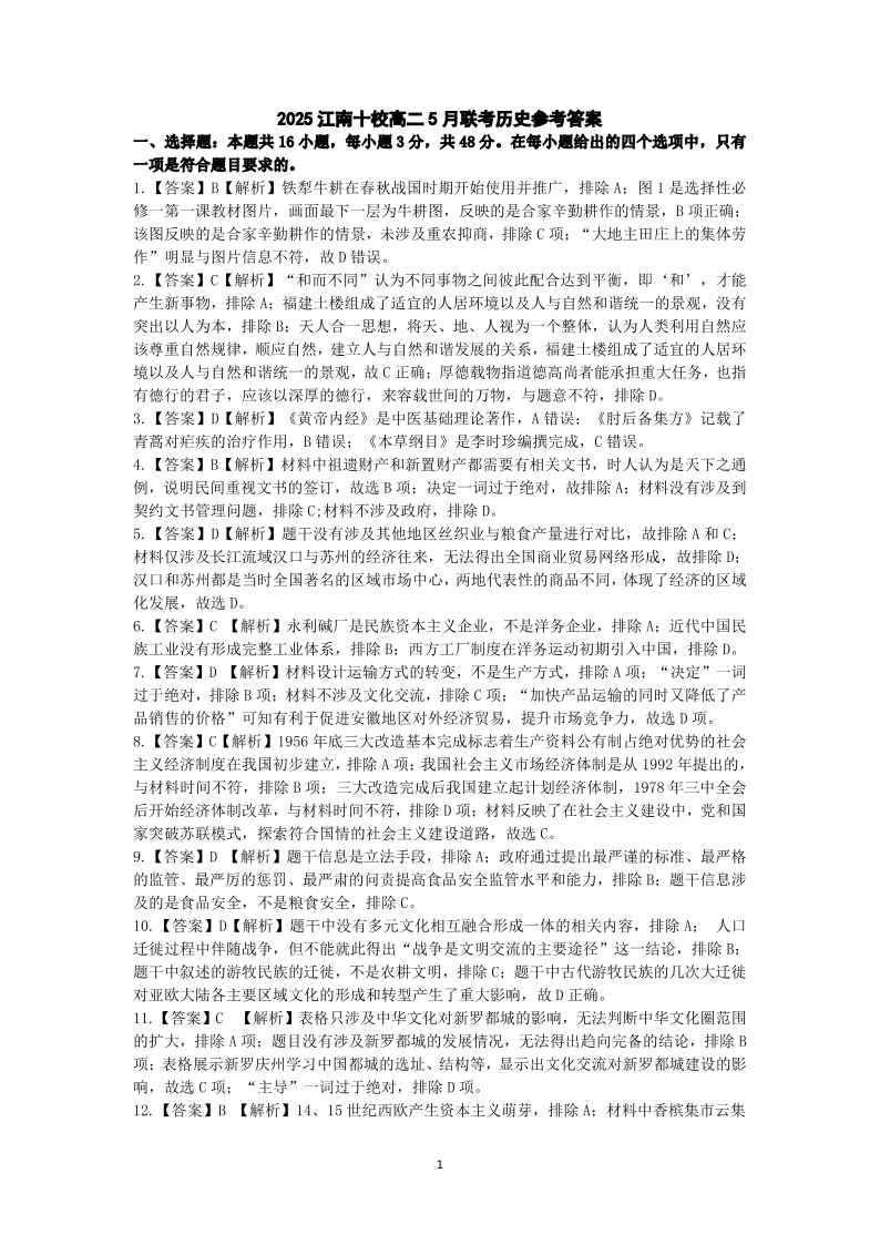 安徽省“江南十校”2024-2025学年高二下学期5月份阶段联考历史答案