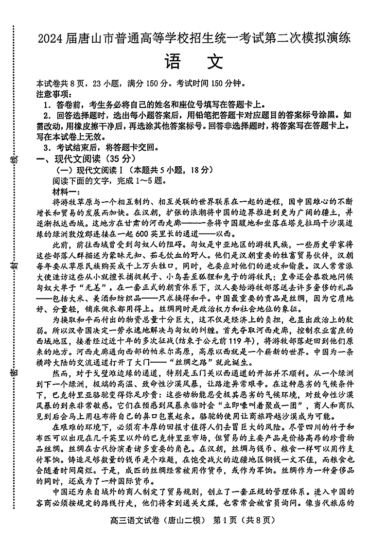 河北省唐山市2024届高三下学期二模考试(唐山二模)语文