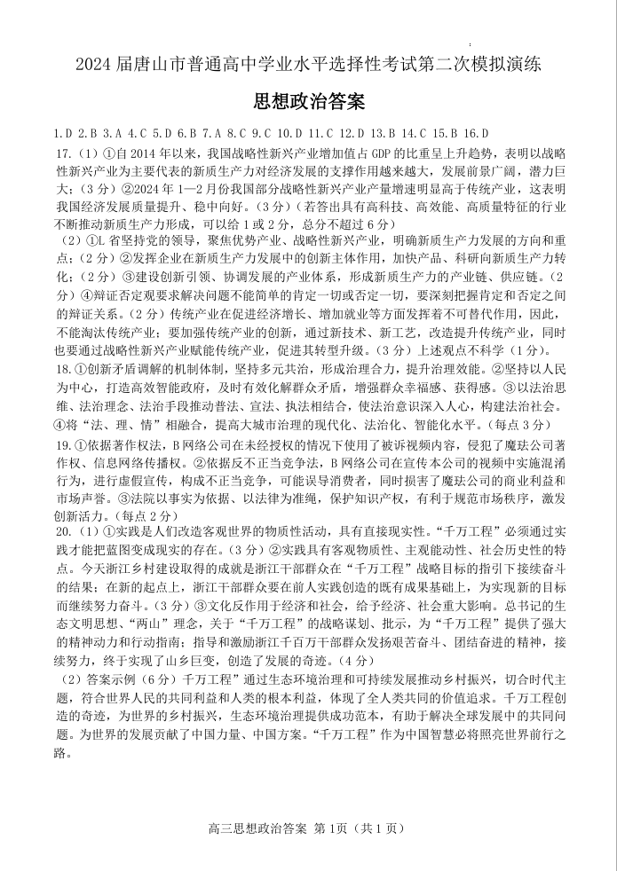 河北省唐山市2024届高三下学期二模考试(唐山二模)政治答案