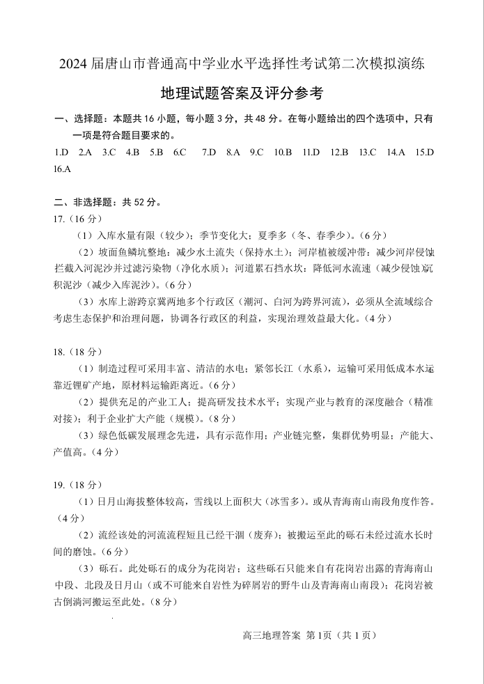 河北省唐山市2024届高三下学期二模考试(唐山二模)地理答案