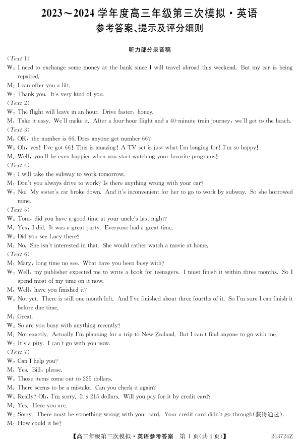 黑龙江省部分学校2024届高三下学期第三次模拟英语答案