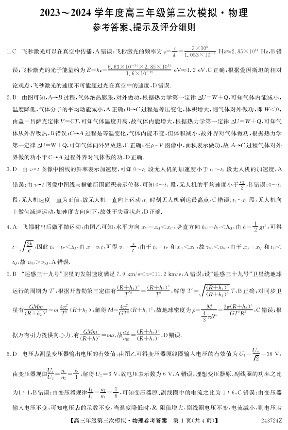 黑龙江省部分学校2024届高三下学期第三次模拟物理答案