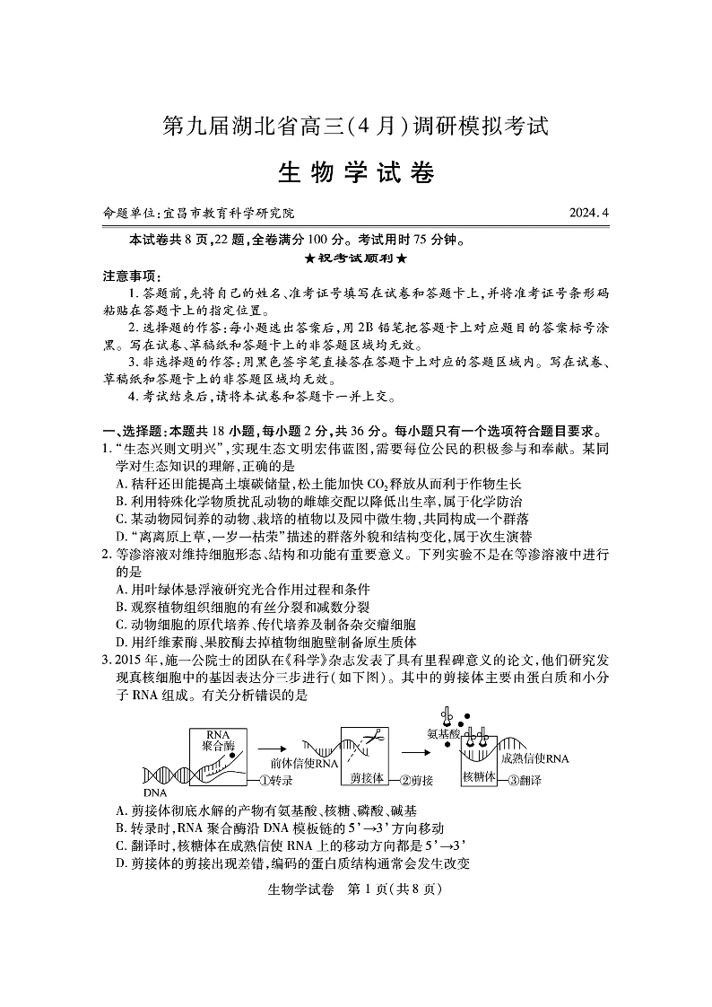 湖北省第九届2024届高三下学期4月调研模拟考试生物+答案