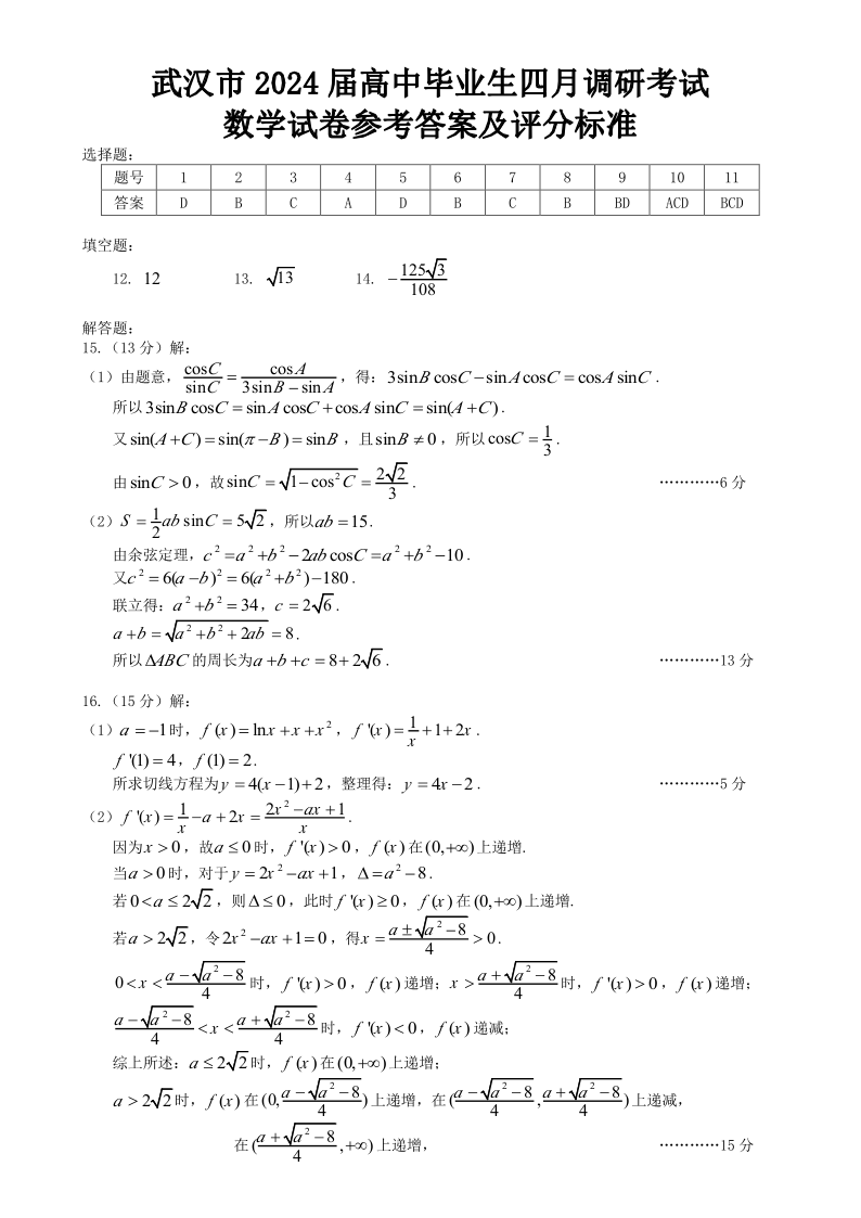 湖北省武汉市2024届高中毕业生四月调研考试数学答案
