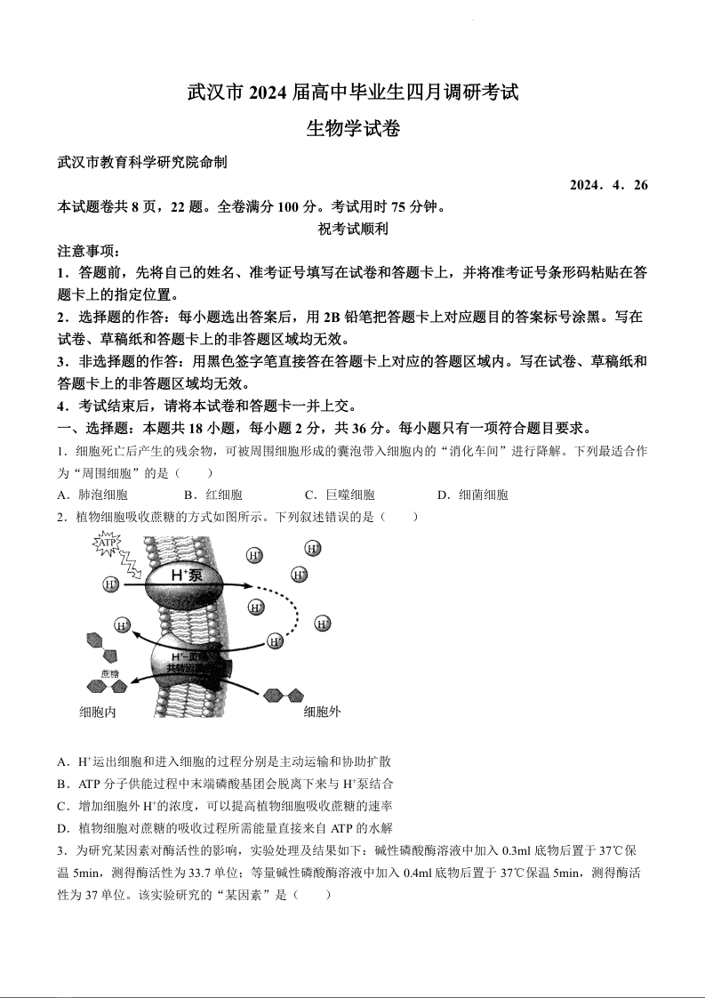 湖北省武汉市2024届高中毕业生四月调研考试生物+答案