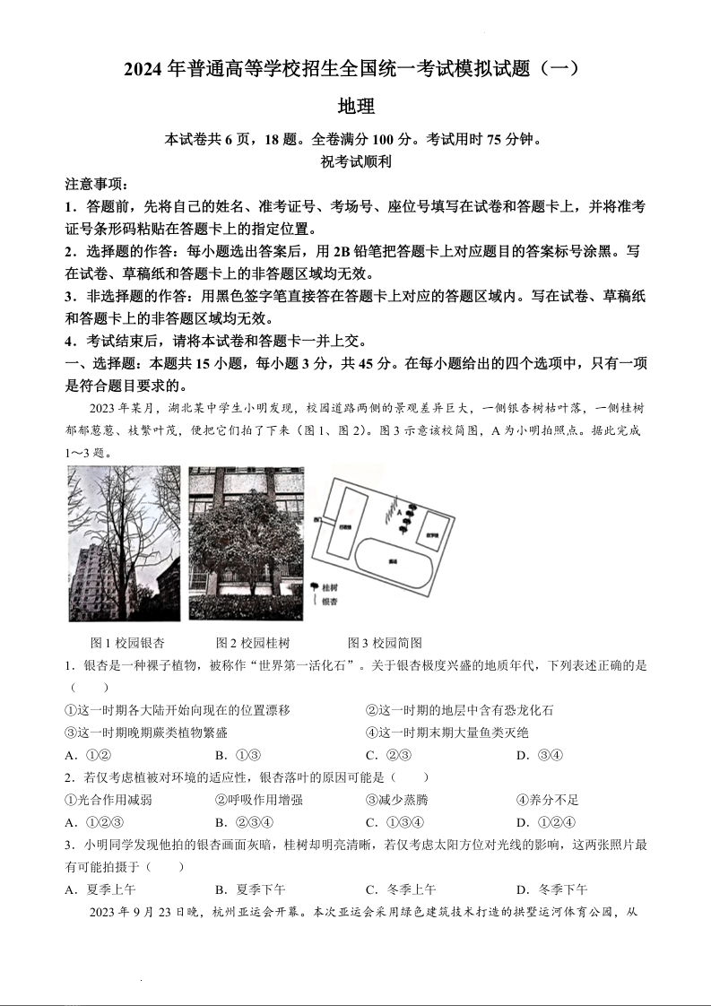 湖北省新高考协作体2024届高三下学期一模考试地理