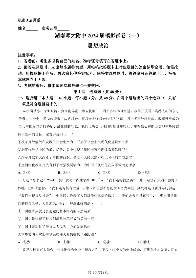 湖南省师范大学附属中学2024届高三下学期模拟考试(一)政治(原卷版)