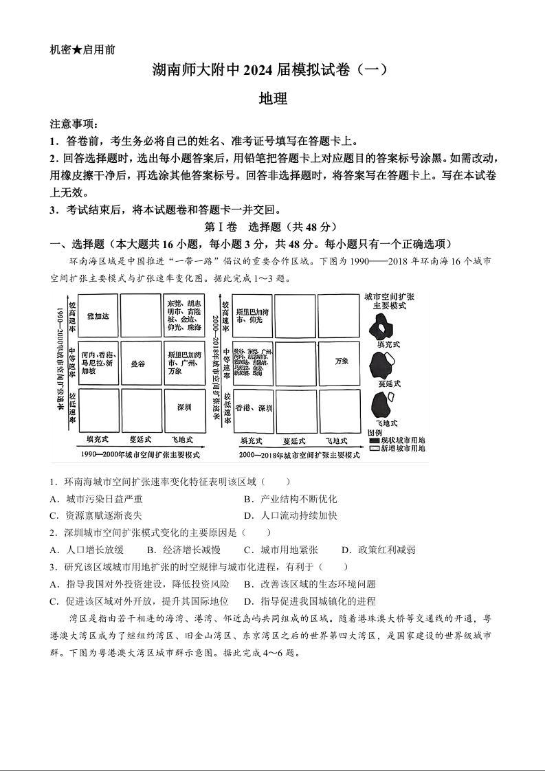 湖南省师范大学附属中学2024届高三下学期模拟考试(一)地理