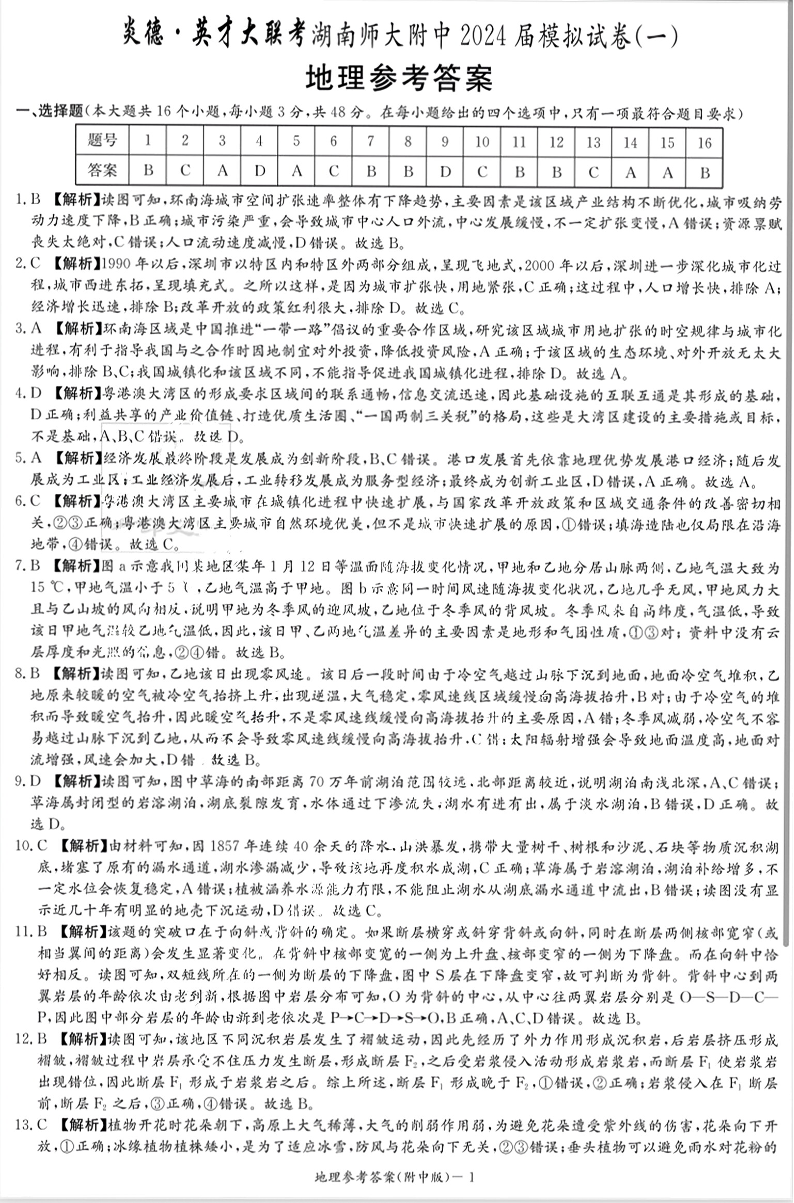 湖南省师范大学附属中学2024届高三下学期模拟考试(一)地理答案