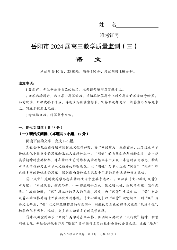 湖南省岳阳市2024届高三教学质量监测(三)(岳阳三模)语文