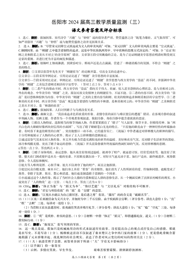 湖南省岳阳市2024届高三教学质量监测(三)(岳阳三模)语文答案