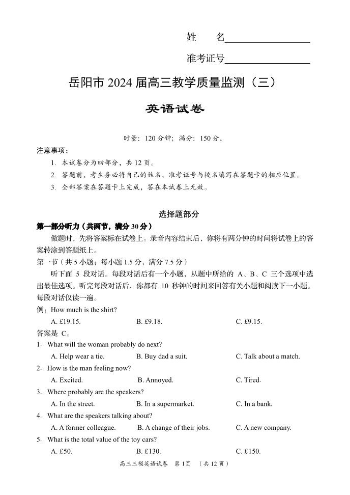 湖南省岳阳市2024届高三教学质量监测(三)(岳阳三模)英语