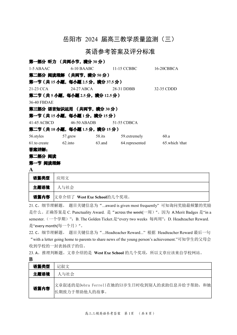 湖南省岳阳市2024届高三教学质量监测(三)(岳阳三模)英语答案