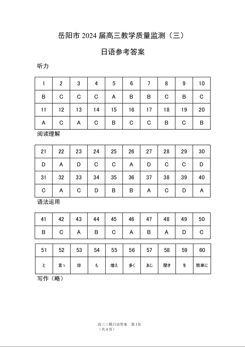 湖南省岳阳市2024届高三教学质量监测(三)(岳阳三模)日语答案