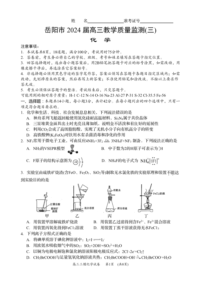 湖南省岳阳市2024届高三教学质量监测(三)(岳阳三模)化学