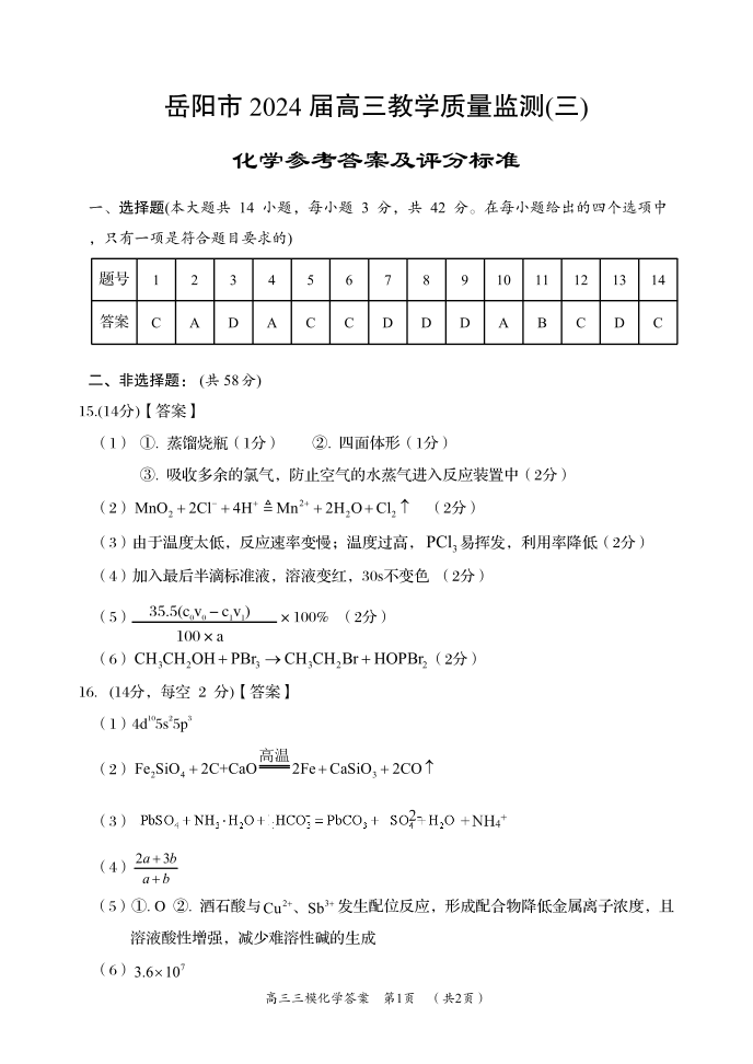 湖南省岳阳市2024届高三教学质量监测(三)(岳阳三模)化学答案